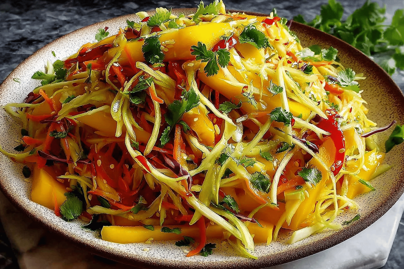 Crisp mango slaw combining sweet fruit, crunchy cabbage, and a light citrus dressing for a bright vegetarian dish.