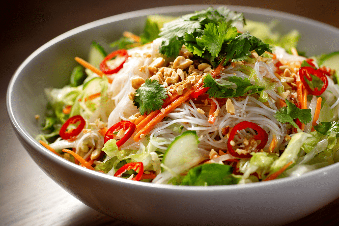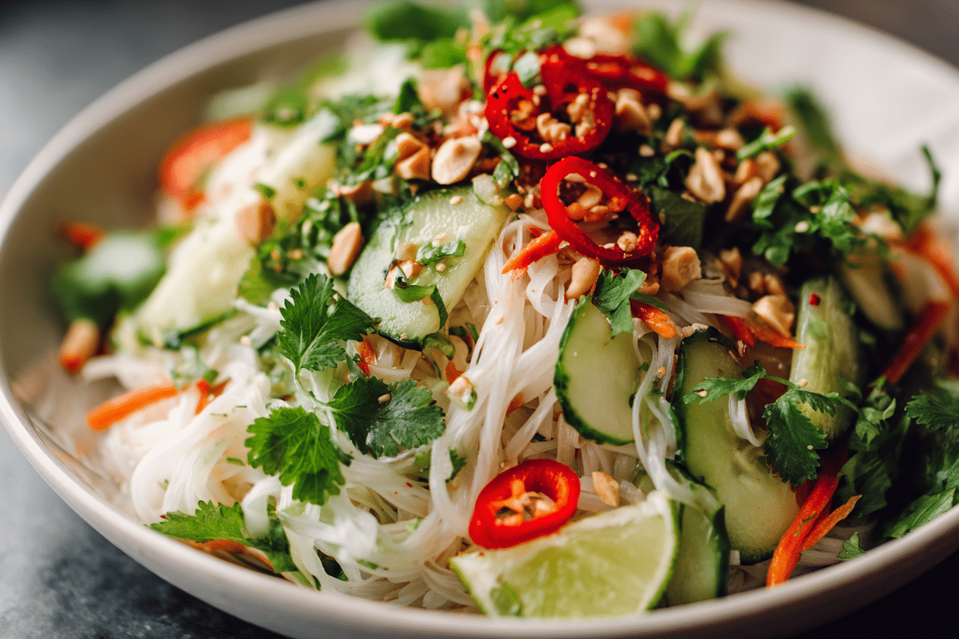 Inspired by classic Vietnamese flavors, this salad layers textures and colors for a meal that tastes as fresh as it looks. Crunchy cabbage and carrots contrast with silky noodles, while herbs add fragrance and depth.