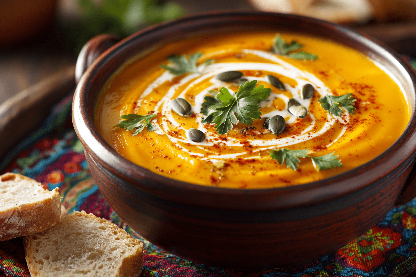 A velvety, spiced roasted pumpkin soup perfect for fall. Made with fresh roasted pumpkin, warm spices, and a creamy swirl of coconut milk or cream.