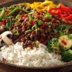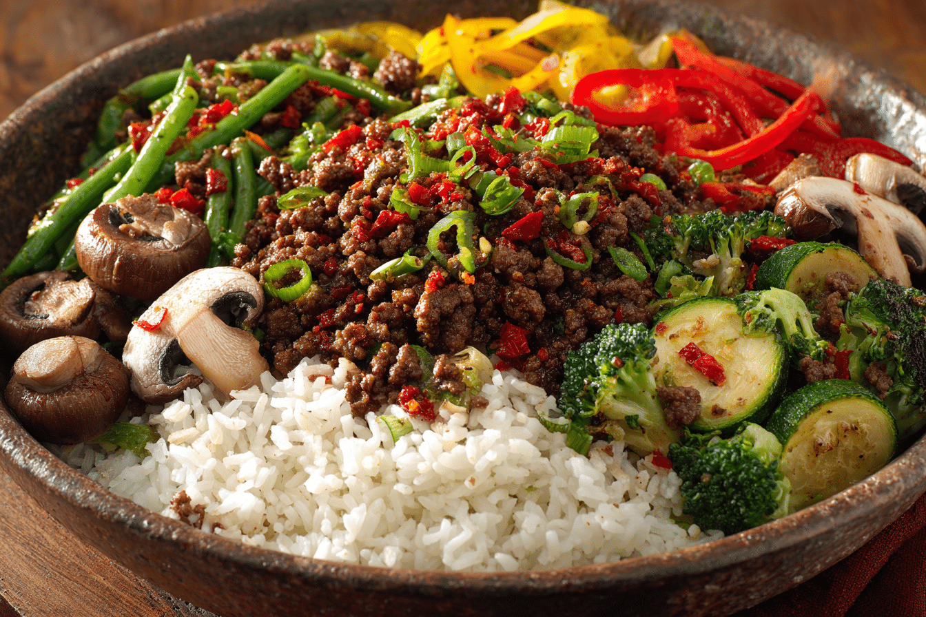 A bold and satisfying stir-fry bowl made with spicy ground beef, garlic-infused veggies, and fluffy rice. A quick, 25-minute dinner that’s perfect for weeknights or meal prep.