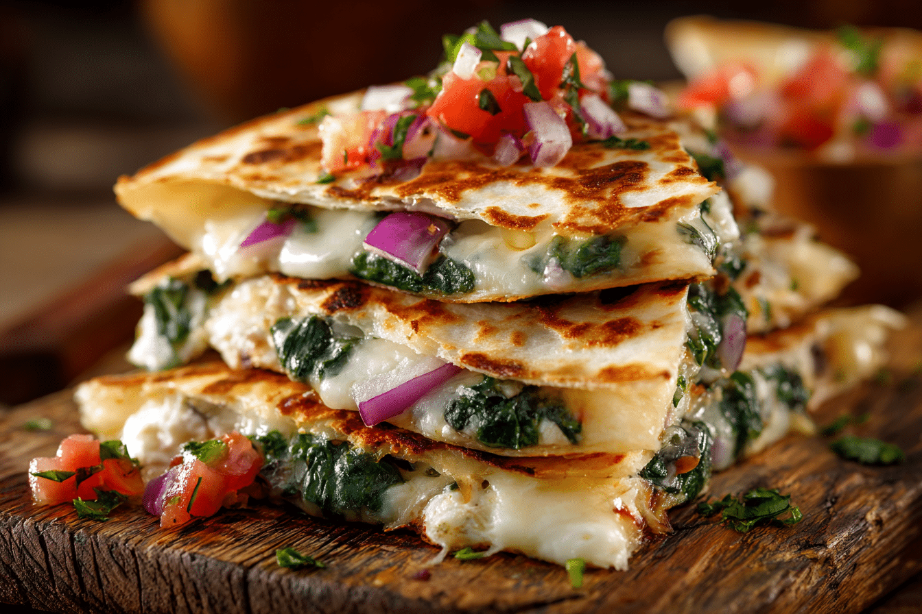 Tender spinach wilts gently between two tortillas, blending with creamy feta and melted mozzarella for a rich yet balanced filling. Thin slices of red onion add subtle sharpness, while olive oil and herbs round everything out. The result is crisp on the outside and warm, savory, and slightly tangy on the inside.