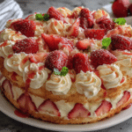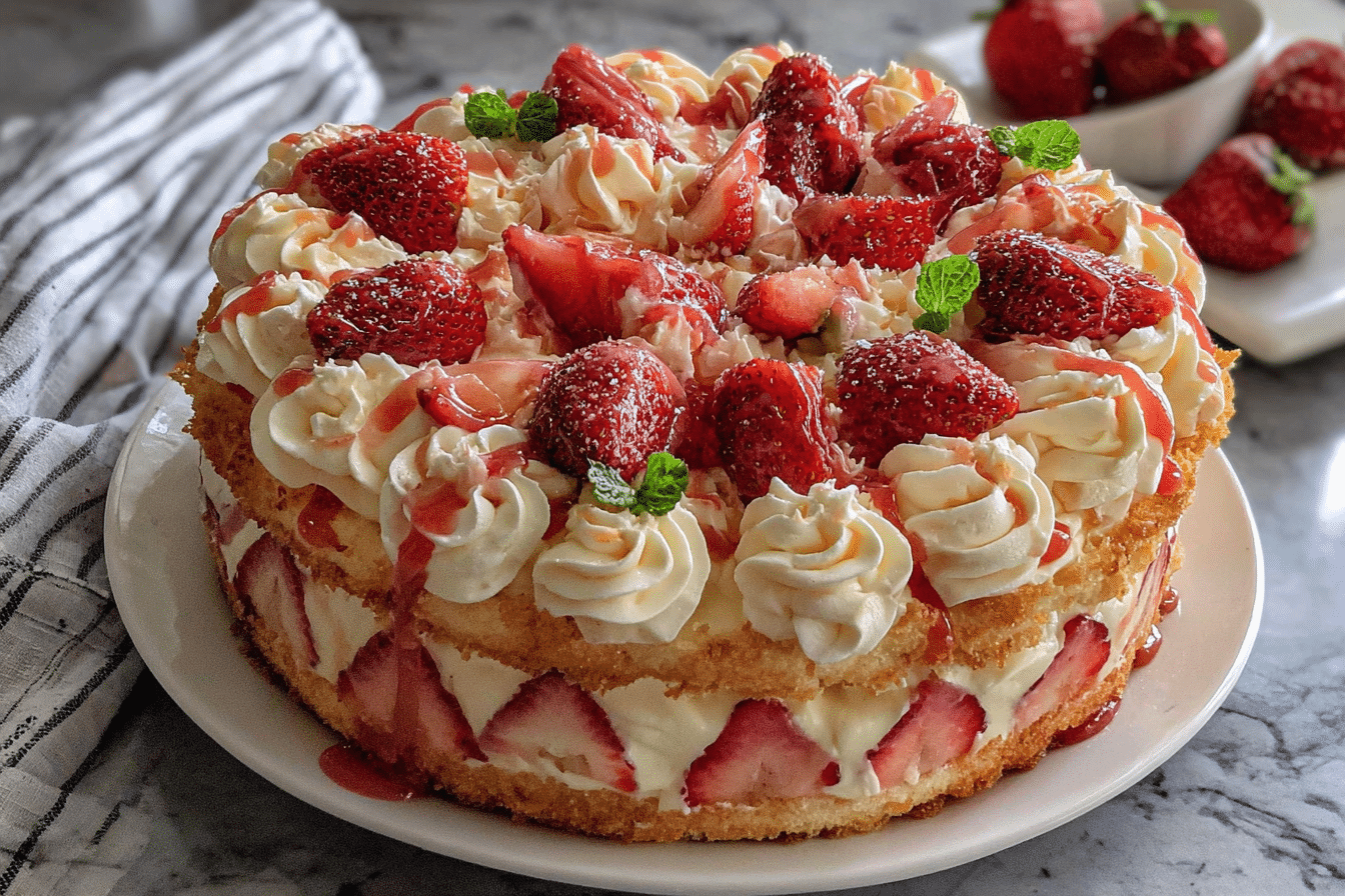 A creamy, layered strawberry dessert with fresh berries, whipped cream, and optional cake or nut layers, perfect for a light and refreshing treat.
