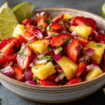 Strawberry Pineapple Salsa is a vibrant, fresh, and tropical treat that combines the sweetness of strawberries and pineapple with zesty lime juice, fresh herbs, and a hint of spice. This colorful salsa is perfect as a dip for chips, a topping for grilled fish or chicken, or a flavorful addition to tacos and salads. Each bite delivers a refreshing balance of sweet, tangy, and slightly spicy flavors, making it an irresistible choice for summer gatherings, picnics, or casual snacks.
