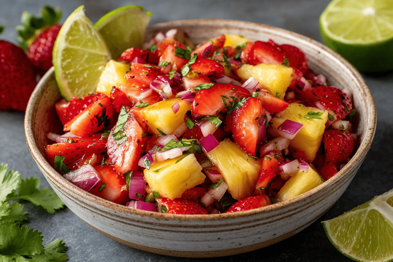 This salsa is quick to prepare, highlighting the natural sweetness and juiciness of fresh fruit while adding layers of flavor with jalapeño, cilantro, and lime. The combination of textures—from juicy strawberries and pineapple to crisp peppers—creates a lively, satisfying experience that’s as visually appealing as it is delicious.