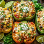 Stuffed Bell Peppers with Rice & Veggies are oven-baked peppers filled with seasoned rice, vegetables, and herbs. The dish delivers a balanced mix of soft filling and tender roasted pepper shells, making it suitable for weeknight meals or shared platters.