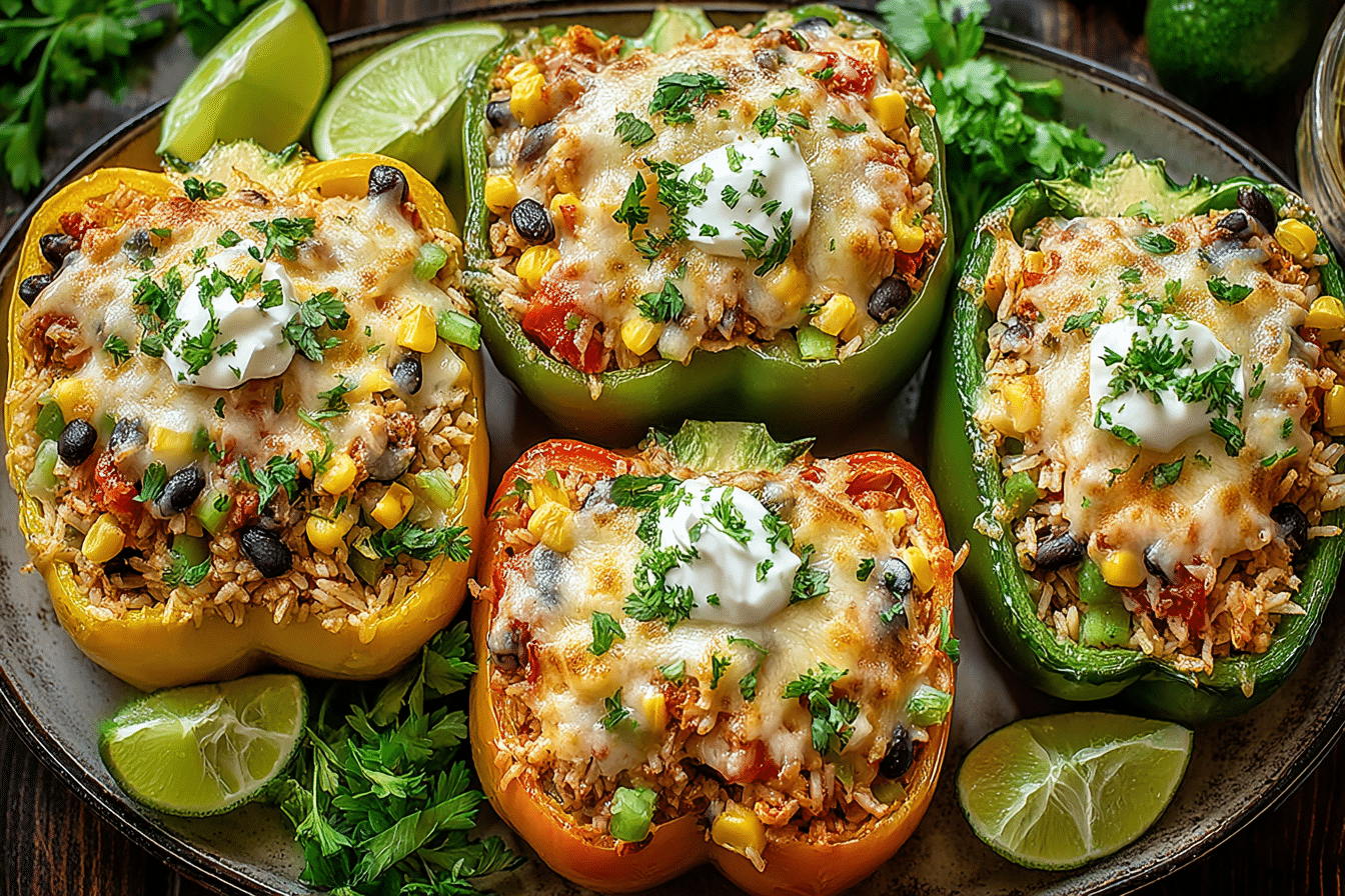 Oven-baked bell peppers filled with seasoned rice, vegetables, and herbs for a balanced plant-based meal.