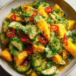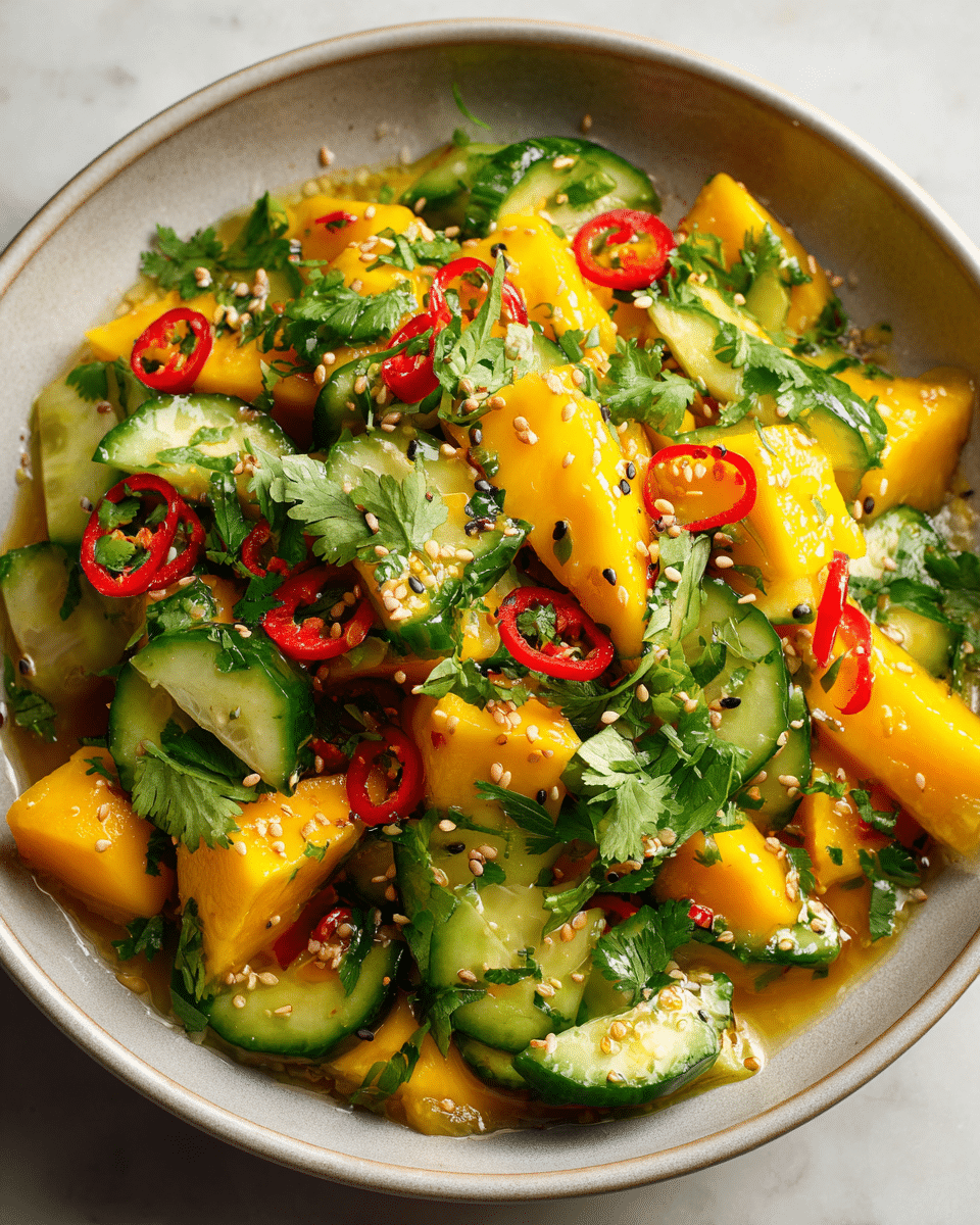A vibrant Thai-inspired salad made with juicy mango, crisp cucumber, herbs, and a tangy lime dressing. Sweet, sour, salty, and spicy in every bite — ready in 15 minutes.