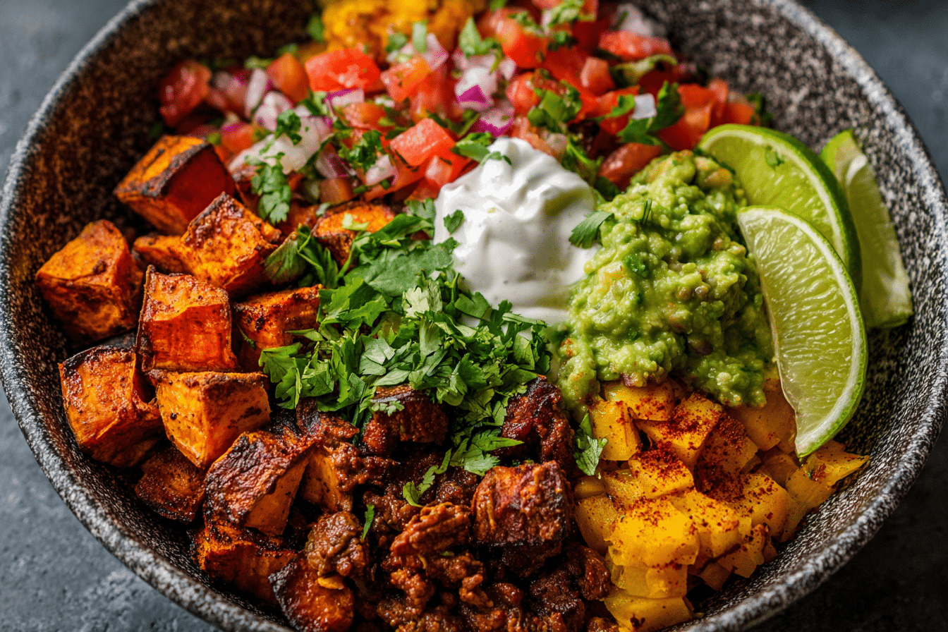 A vibrant, plant-based Sweet Potato Taco Bowl loaded with roasted sweet potatoes, black beans, fresh veggies, and smoky spices. A quick, nourishing dinner everyone will love.