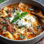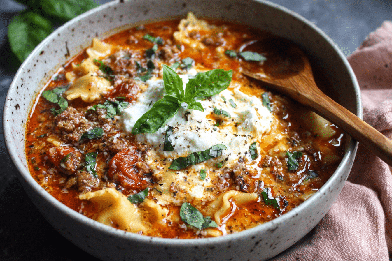 Creamy lasagna soup brings together the bold flavors of lasagna — meat, tomato, cheese, and pasta — in a warm, easy-to-make one-pot meal with a rich, velvety finish.
